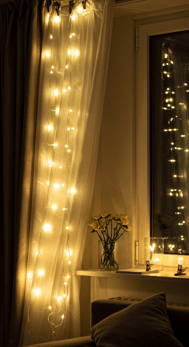 Tie those layered neutrals together with the soft glow of warm white LED curtain lights, which add vertical interest and a gentle, luminous backdrop without competing with tactile details.