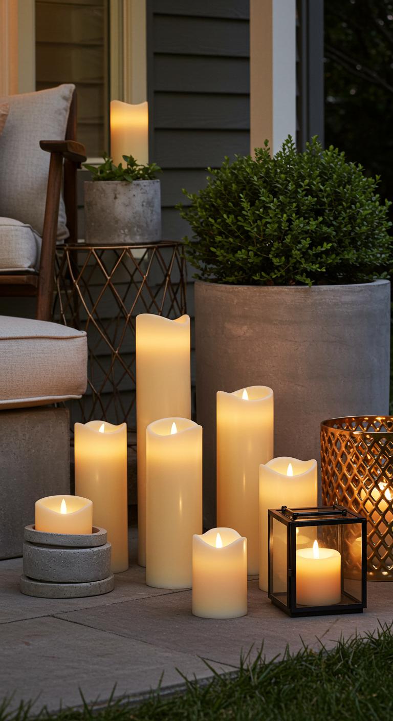 Candle-style LED pillars give your porch a warm, curated glow without the hassle of open flames, and they’re perfect for layering with concrete planters and metallic accents.
