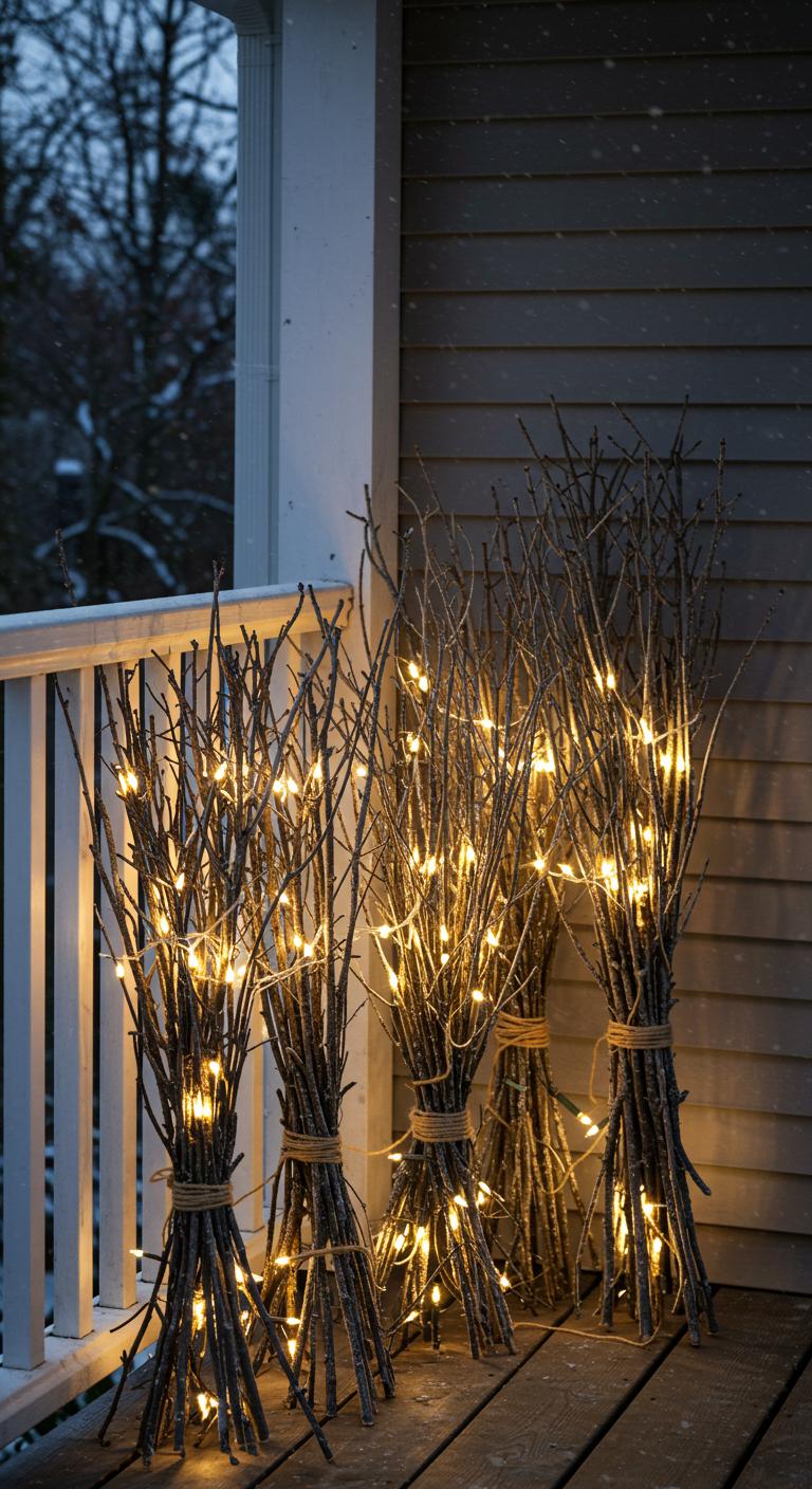 Although frost-kissed branches suggest a winter wildness, bundling them with warm white fairy lights pulls that raw texture into a refined porch statement you can assemble in an afternoon.