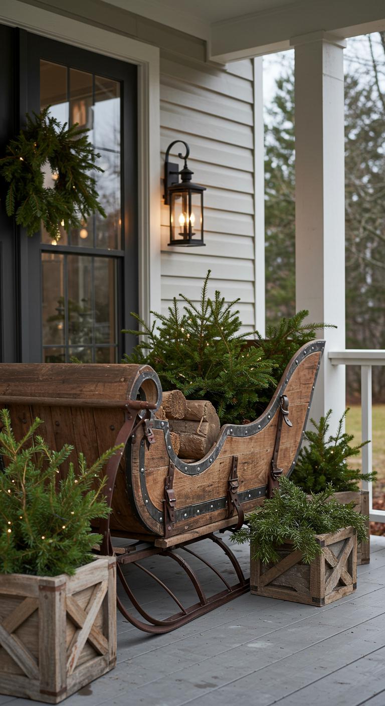 Because rustic charm pairs so well with streamlined silhouettes, modern rustic sleigh displays give your porch an updated holiday focal point that feels both nostalgic and purposeful.
