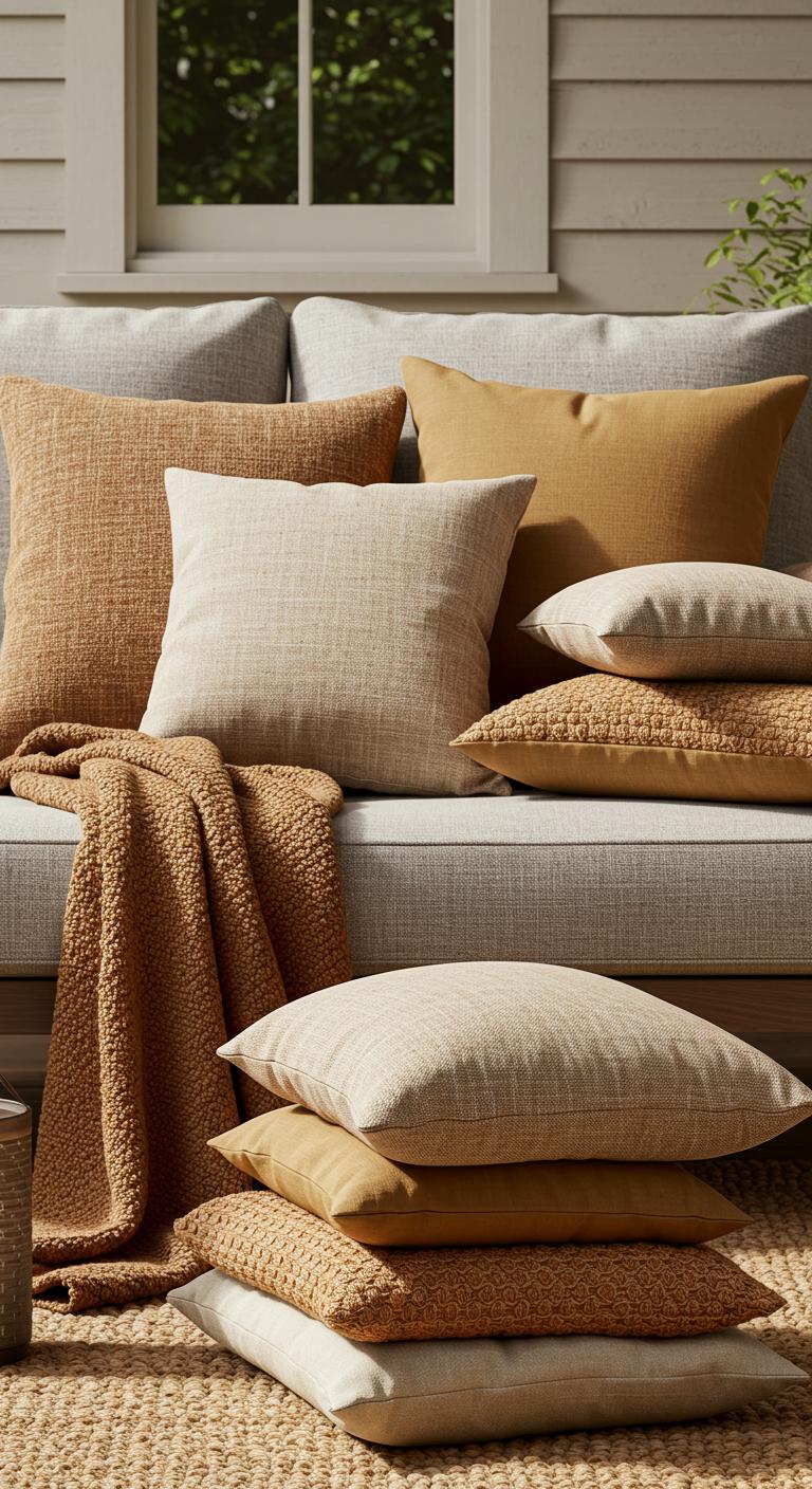 A neutral palette anchored in warm creams, soft taupes, and muted greys lets texture do the seasonal talking, so you’ll rely on layered materials—wool throws, woven doormats, rattan baskets, and weathered wood—to create depth without bold color.