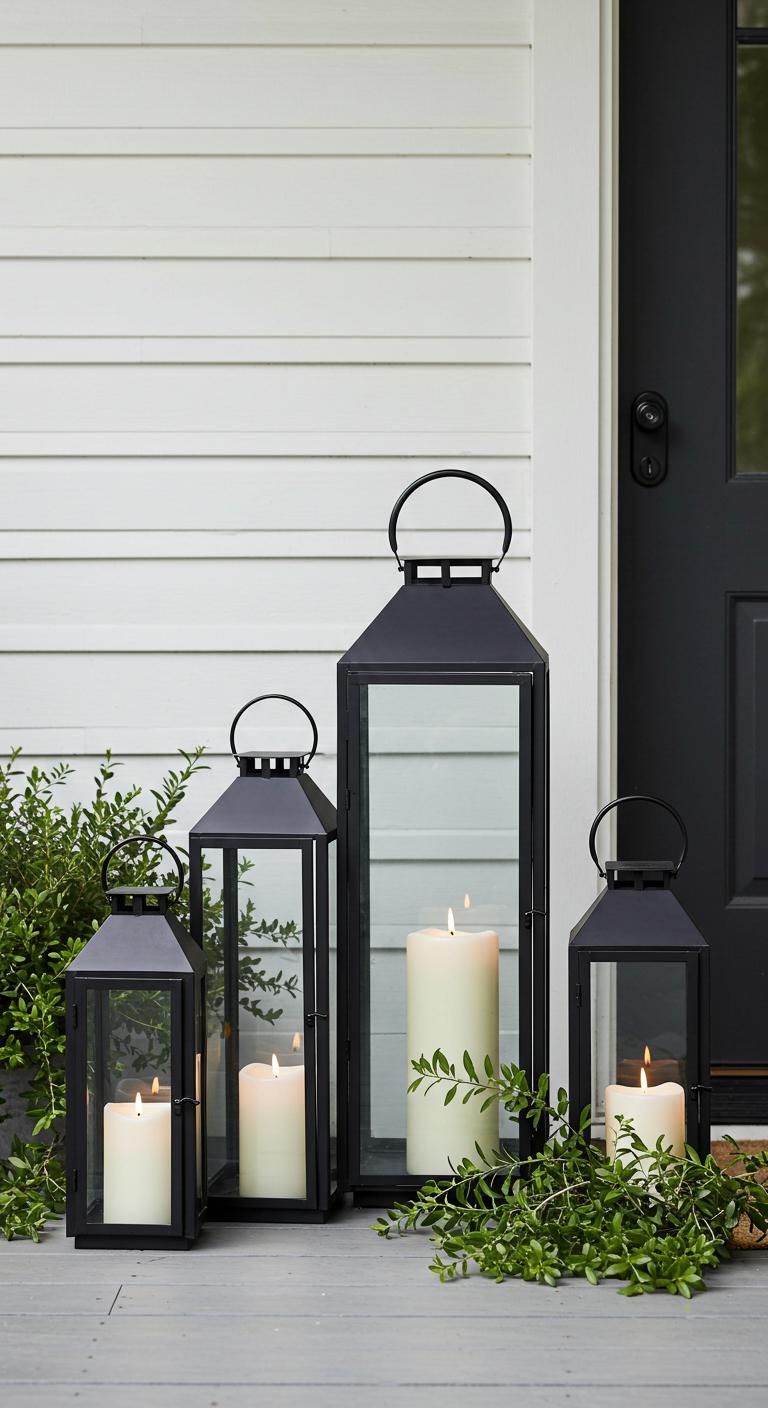 Three matte black lanterns of varying heights make a striking, contemporary anchor for porch styling, and you’ll find they balance bold contrast with understated elegance.