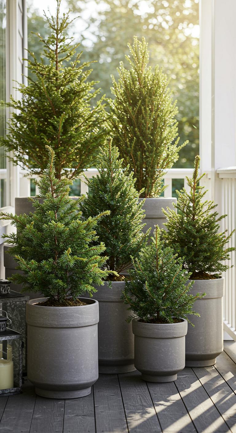 When you group potted conifers by height and texture, they create an architectural focal point that reads both seasonal and sophisticated.