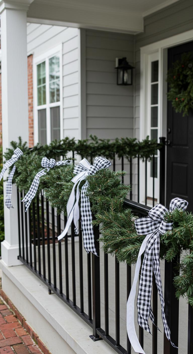 Contrast can be striking: tie together sleek, modern porches with monochrome ribbon bundles that read as minimalist statements instead of fussy bows. You’ll choose monochrome color schemes to simplify impact, then apply precise ribbon layering techniques for depth without clutter. Place compact bundles on railings or planters, vary textures, and trust restraint — you’ll create a liberated, refined holiday look that feels intentional, not constrained.