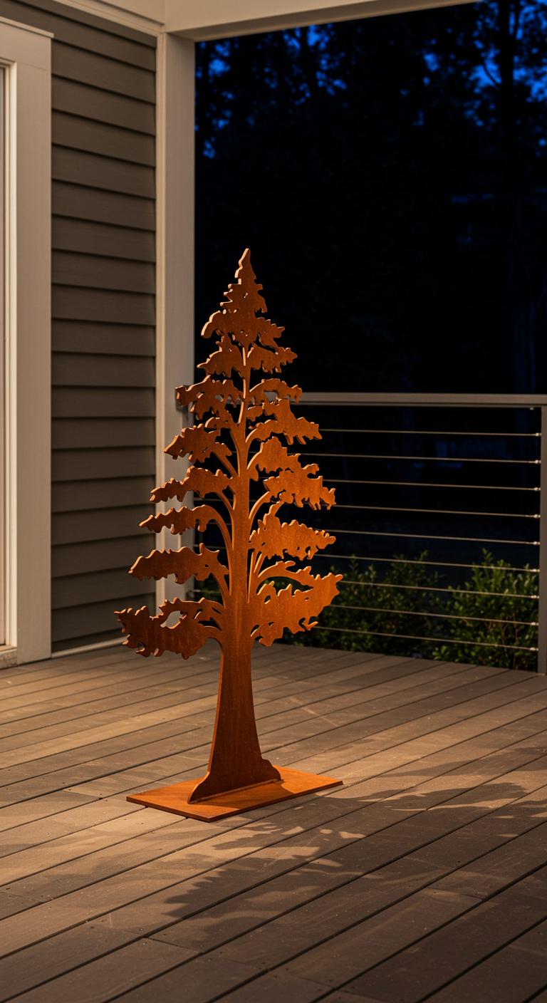 A metal silhouette makes a bold, contemporary statement on a modern porch, and you’ll love how its clean lines read from a distance without competing with other decor.