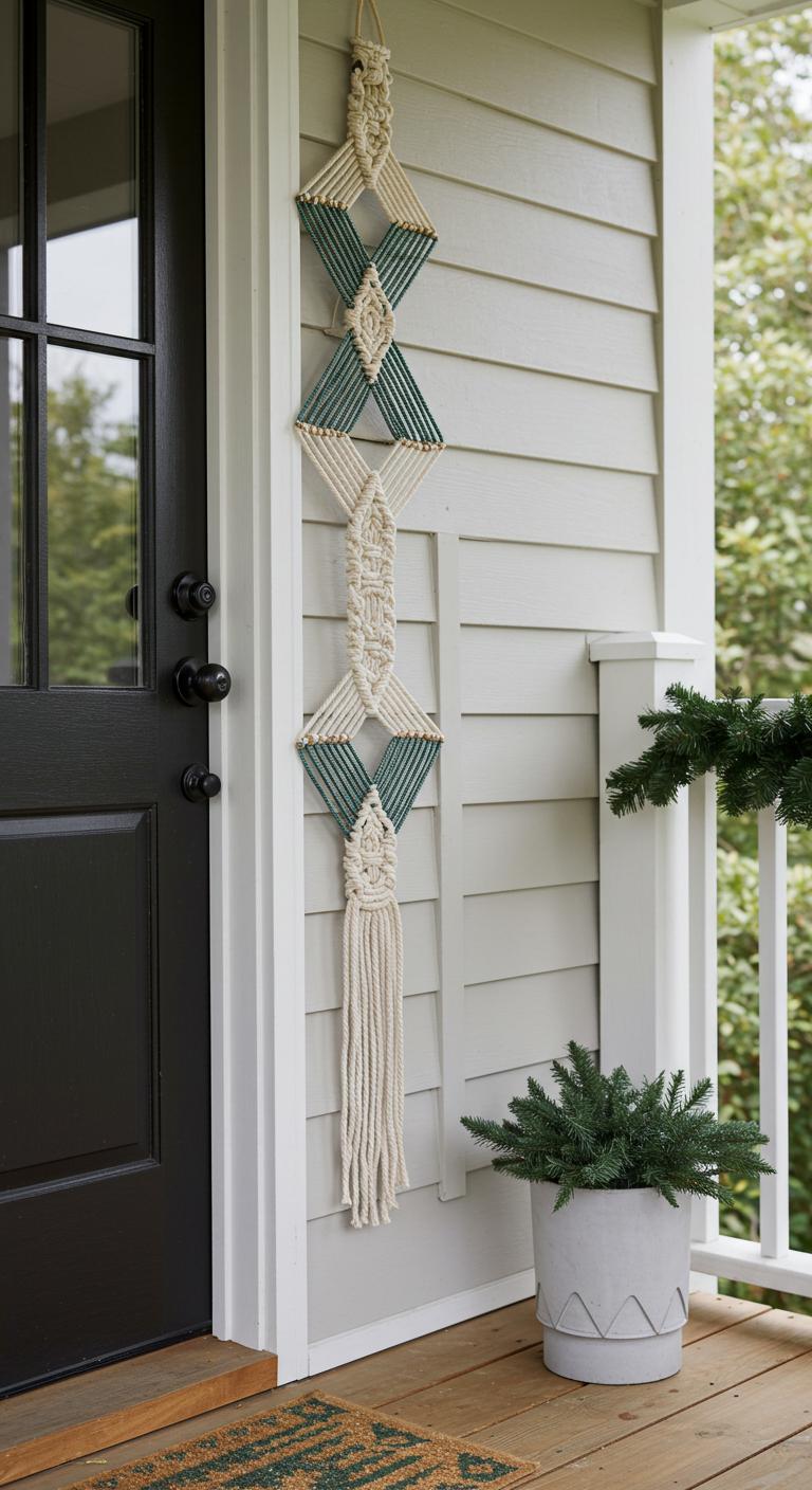 Think of geometric rope garlands as modern macramé with an architectural edge—you’ll drape clean, sculptural lines across your porch that read as both ornament and structure.