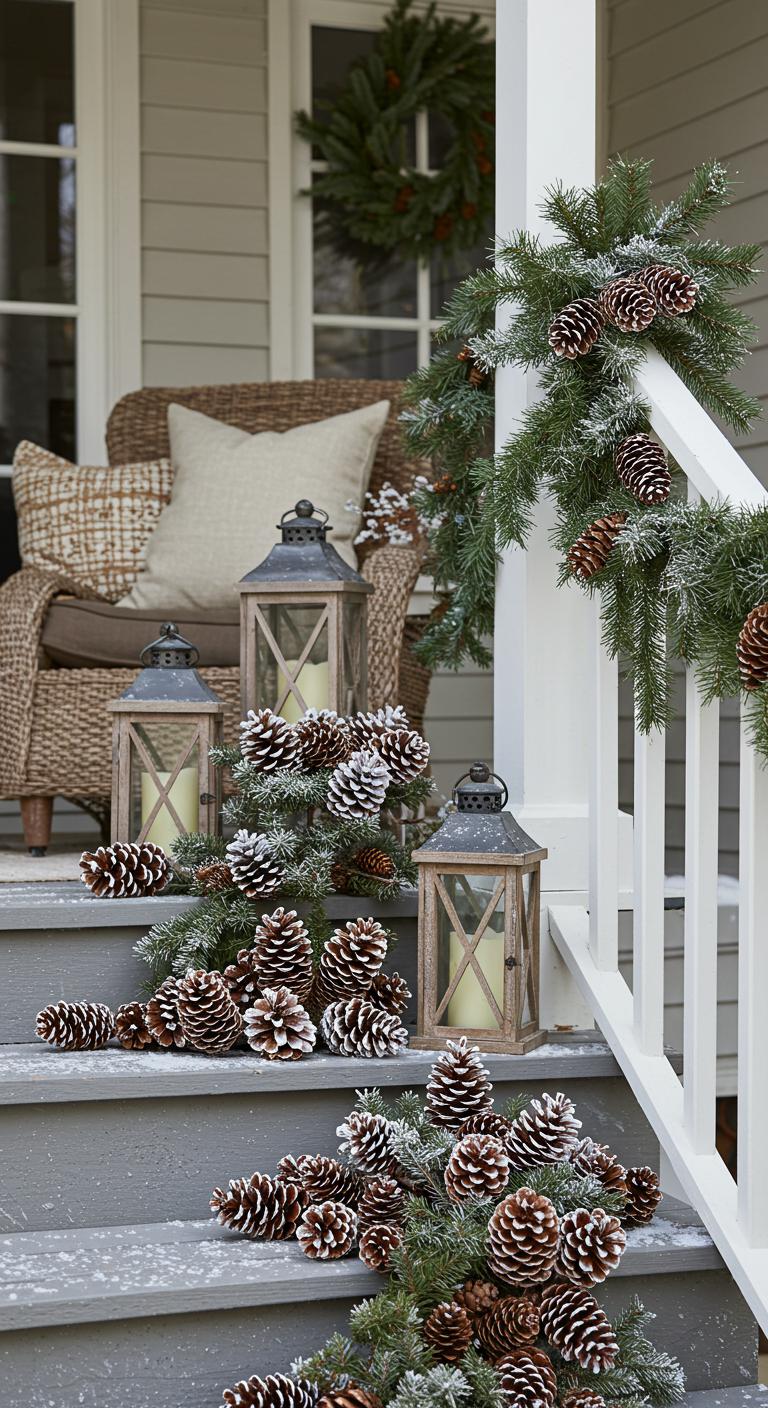 You’ll place frosted pinecone centerpieces on steps or alongside lanterns, mixing sizes for dynamic rhythm.