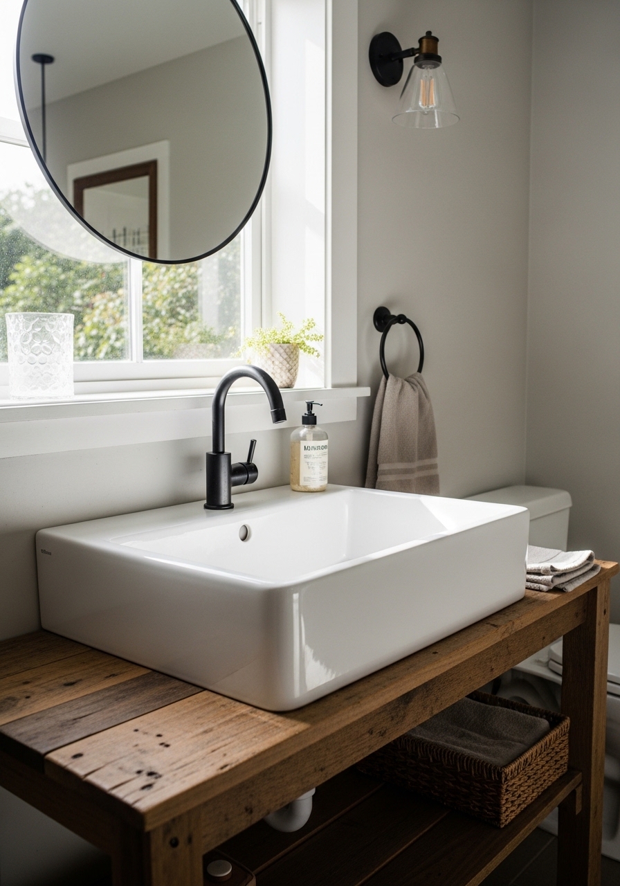 A wooden mirror above the sink adds warmth. I sourced mine from a thrift store and stained it to match my floors – budget-friendly magic.