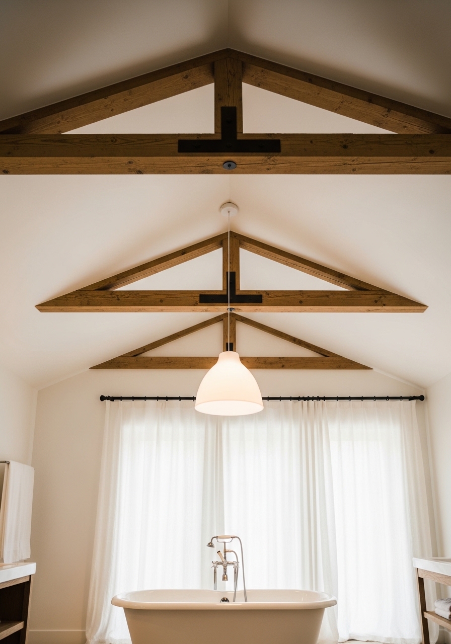 Incorporating exposed beams on the ceiling adds architectural interest to your farmhouse bath. When I visited a friend’s cabin, her bathroom had this, and it inspired me to faux-beam mine. It creates height and that cozy, timeless feel without major renovations.