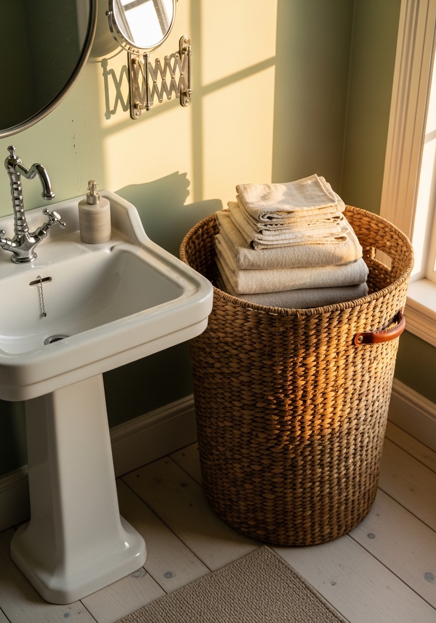 Using a woven hamper for linens or laundry adds texture and functionality. I placed one in my laundry nook, and it’s way better than plastic bins. It blends seamlessly with farmhouse decor and keeps things tidy with minimal effort.