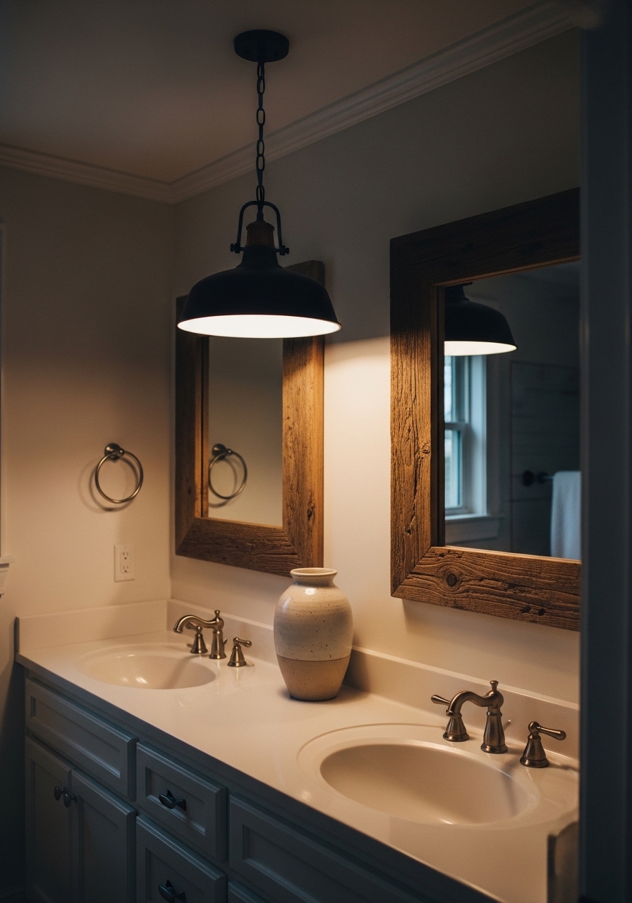 Having two sinks with mirrors and lights makes mornings less chaotic. My hubby and I fought over counter space until we added this – now it’s our peaceful zone. Add some pendant lights for that extra farmhouse charm.