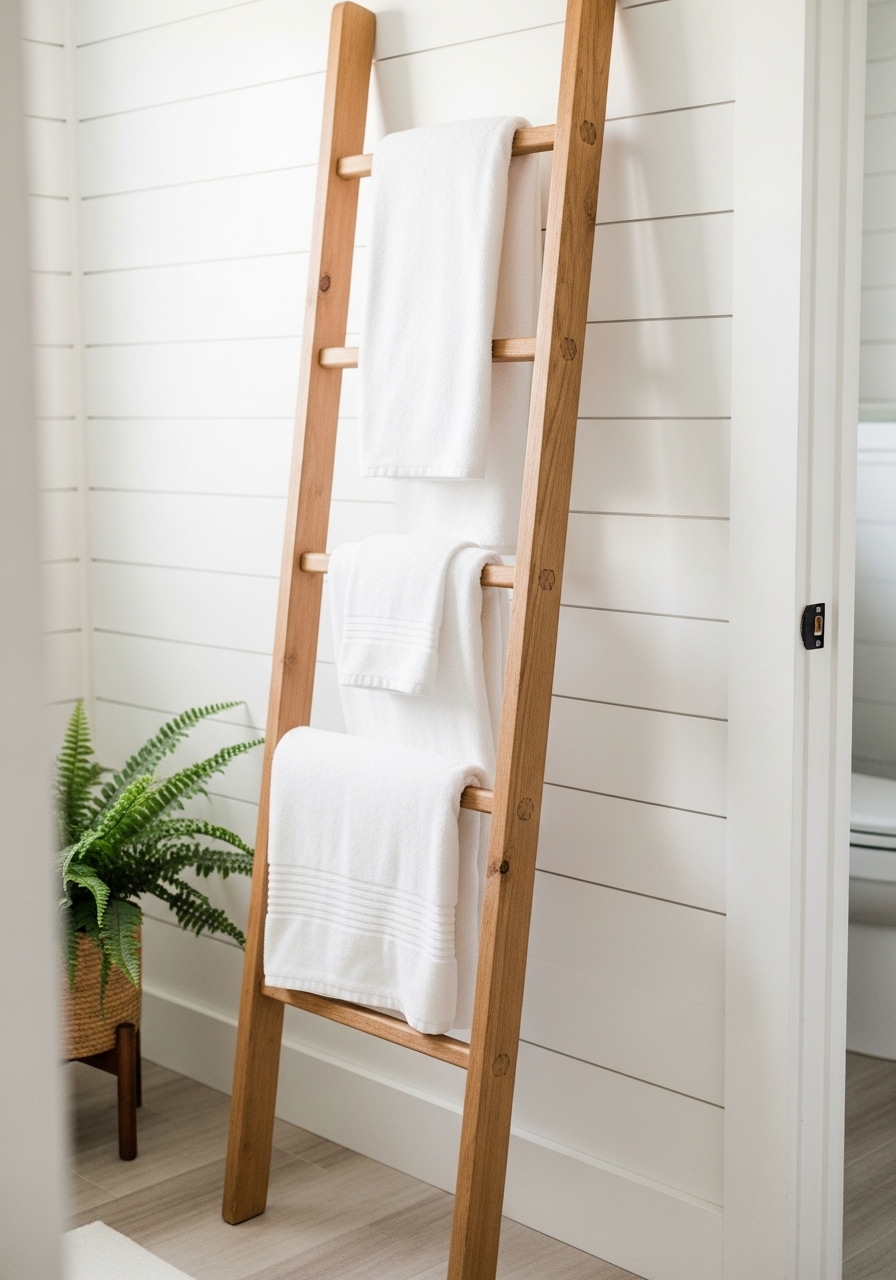 A vintage ladder repurposed as a towel rack saves space and adds charm. I leaned one in my guest bath, and visitors always comment on it. It’s perfect for hanging robes too, keeping the floor clear.