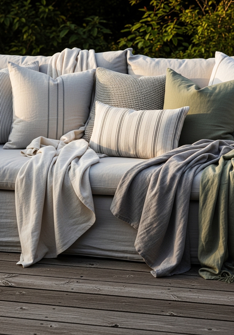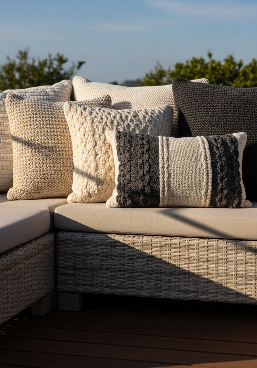 I mix linen, knit, and woven pillows in cream, taupe, and charcoal. Texture matters more than pattern. I use 20×20 outdoor linen pillows and 22×22 knit pillow covers. Styling tip: odd numbers look calm—use three or five. Mistake: too many competing textures—limit to 2–3.