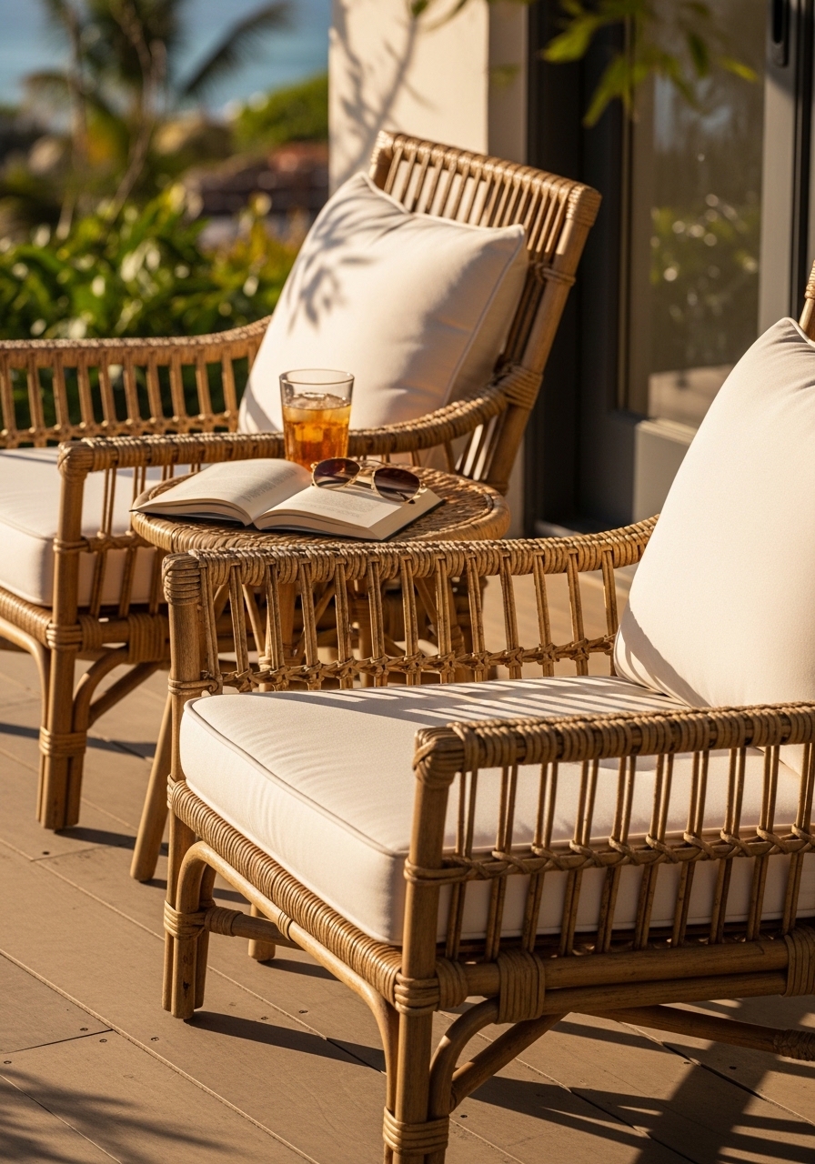 I swapped plastic chairs for woven rattan ones. The texture adds warmth. I used rattan lounge chairs with 24-inch deep seats and outdoor seat cushions for $40 each. Styling tip: vary cushion heights for depth. Mistake to avoid: picking cushions that are too thin—look for 3–4 inch fill to avoid sag.