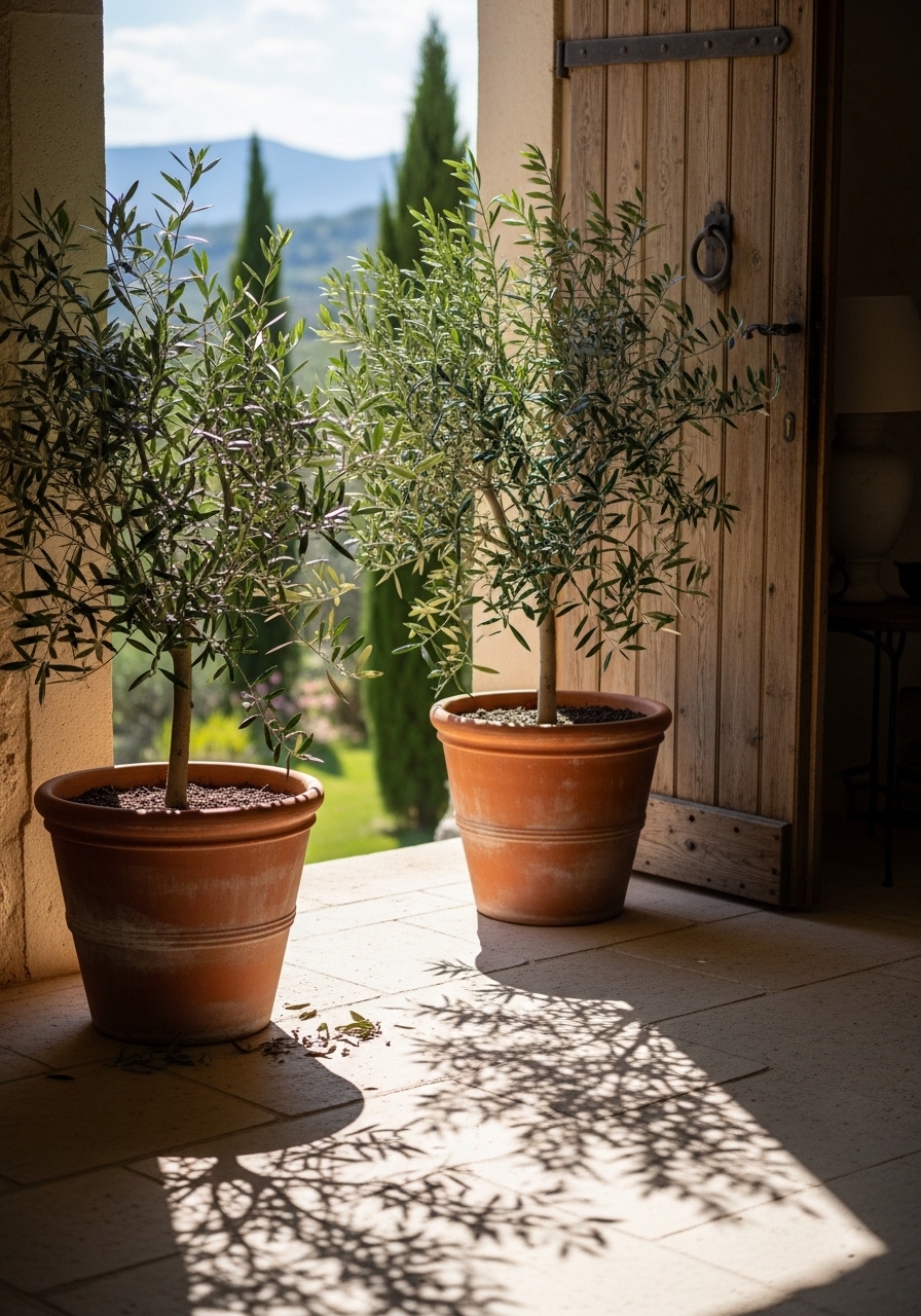 I added 4-foot olive trees in terracotta pots to bring sculptural greenery. They read relaxed and modern. I used a 4-foot olive tree and terracotta pots 16 inch. Styling tip: place uneven numbers—one on one side, two on the other for balance. Mistake: overcrowding—give each pot breathing room.