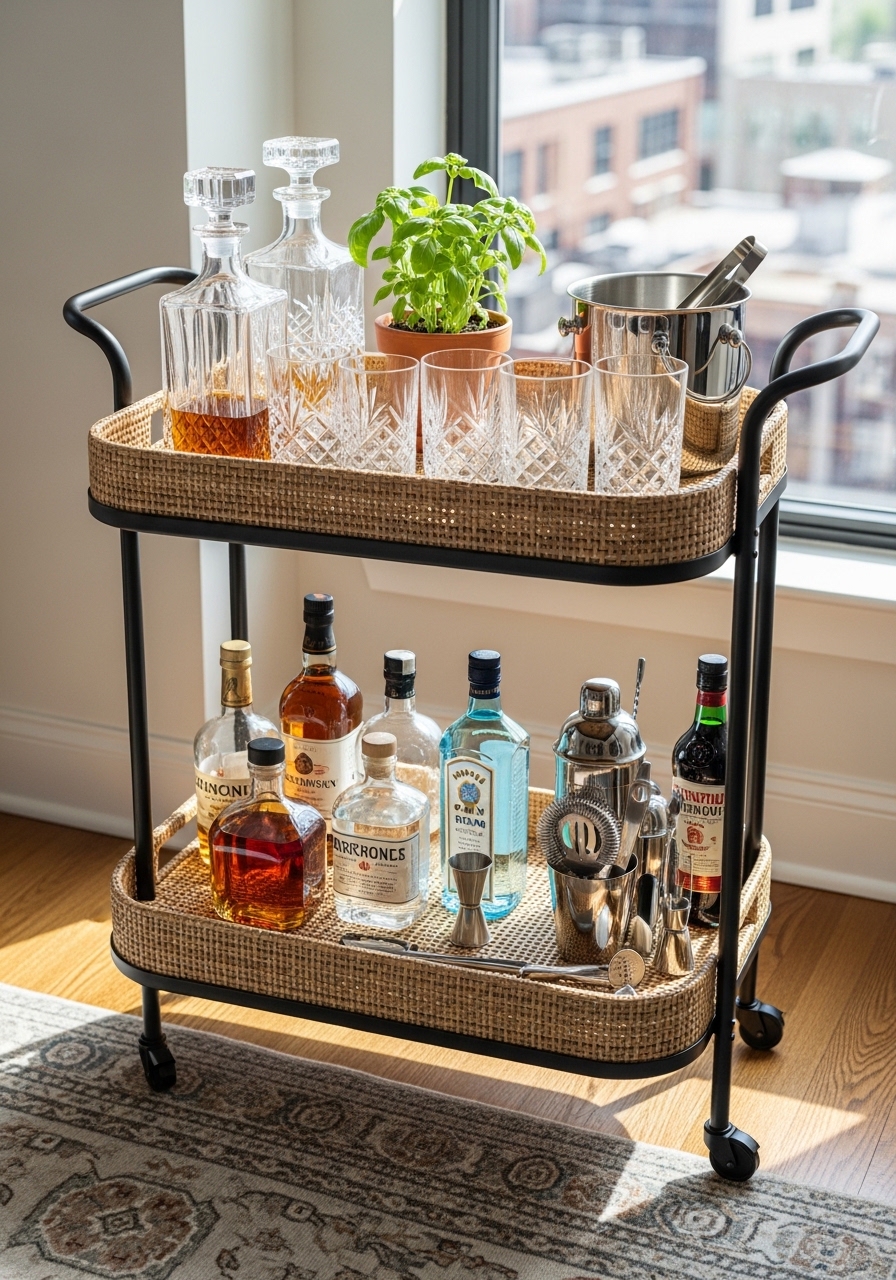 I keep a metal bar cart with rattan trays for drink service. It looks intentional and moves easily. I bought a two-tier bar cart and woven trays 18 inch. Styling tip: group bottles in odd numbers. Mistake: overloading the cart—leave space so it doesn’t look cluttered.