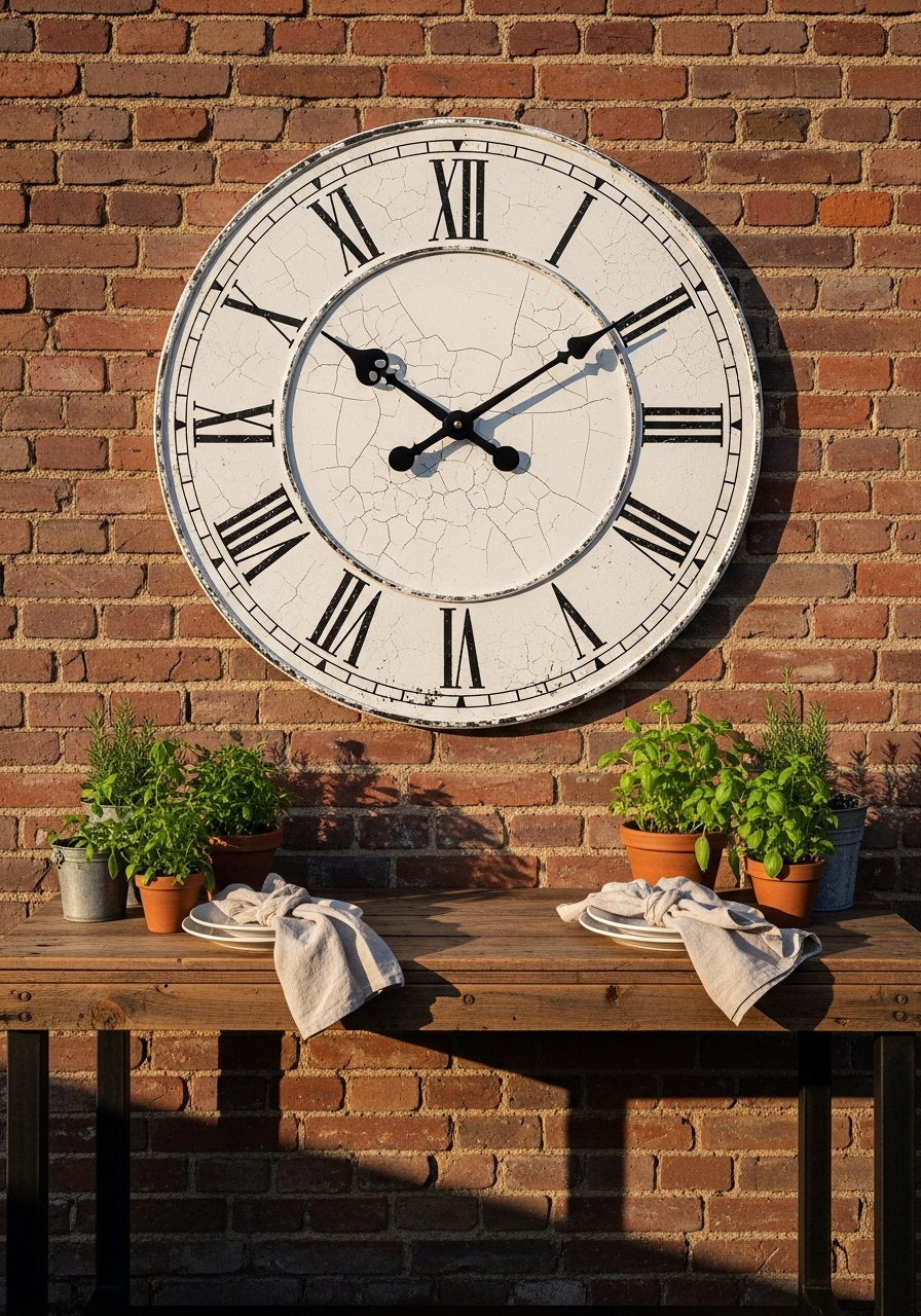 I added a 24-inch farmhouse-style outdoor clock so guests know when it's time for dessert. I prefer muted faces with black numerals. I use a 24-inch outdoor clock. Styling tip: place it at eye level from seating. Mistake: tiny clocks on large walls—they disappear.