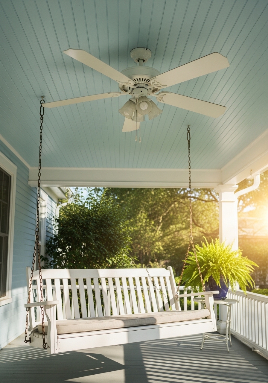 I painted our porch ceiling a soft Benjamin Moore Palladian Blue. It reads fresh and airy. For renters, try peel-and-stick sky-blue wallpaper. Styling tip: pair with white trim and natural wood accents. Mistake: using high-saturation blues—they can feel heavy under electric light.