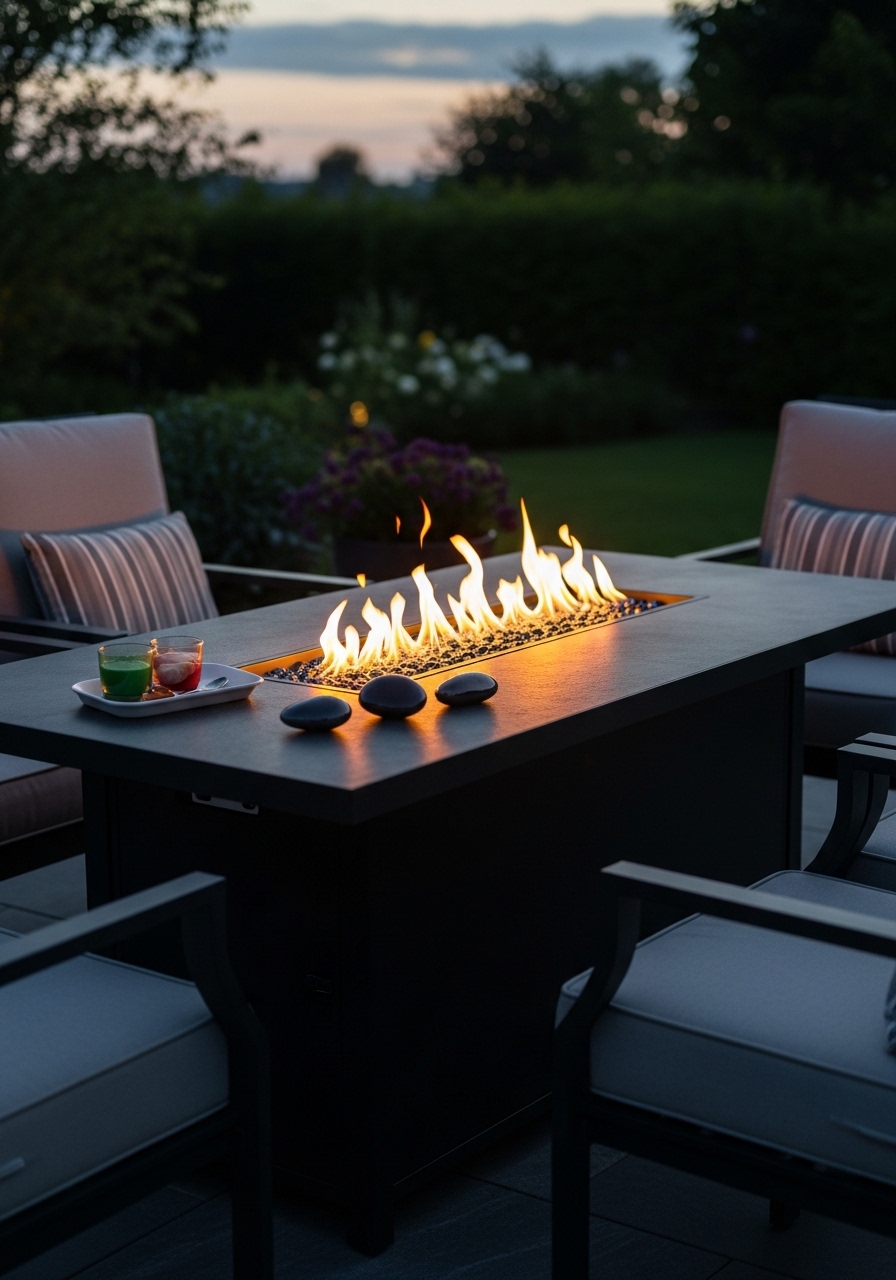 I chose a propane fire pit table so it doubles as a coffee table. It adds warmth and a glow. I use a rectangular propane fire pit table. Styling tip: keep flammable textiles a safe distance. Mistake: placing the table too close to combustible plants or curtains.