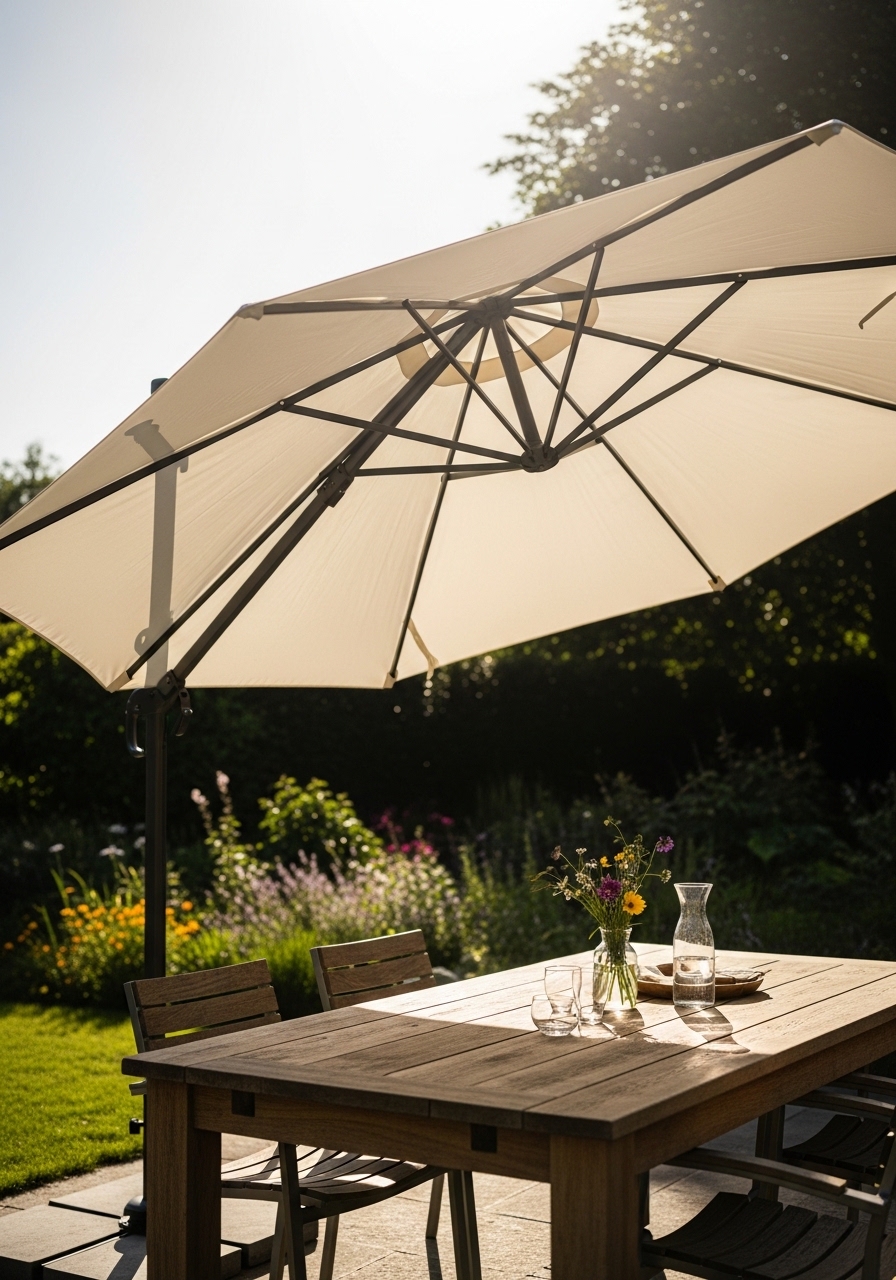 I use a 9-foot off-white umbrella with a tilt to block afternoon sun. The neutral color blends with linens. I use a 9 ft outdoor umbrella and a heavy-duty umbrella base. Styling tip: match umbrella color to cushions. Mistake: using a too-small base—it will tip in wind.
