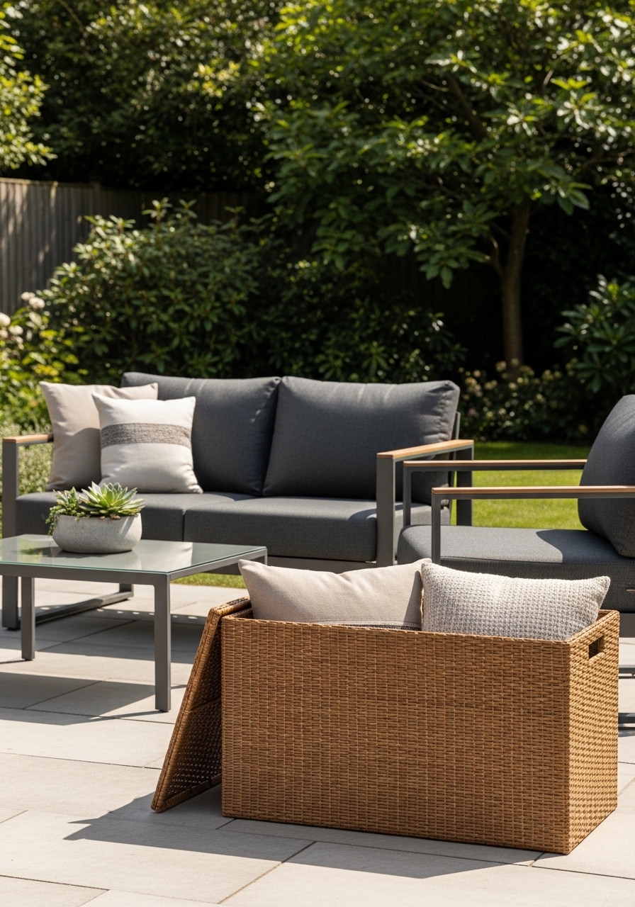 I keep cushions dry in a weatherproof 120-liter storage tote. It saves trips inside when storms come. I use a 120L outdoor storage tote. Styling tip: choose a neutral tote that disappears into your scheme. Mistake: storing damp cushions—they mildew.