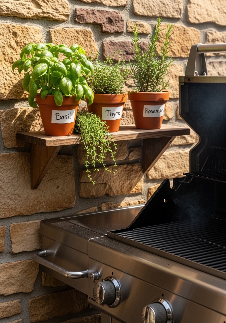 I mounted a 36-inch shelf for herb pots next to the grill. Fresh herbs are handy and look homey. I use herb pot set 4 inch and a 36-inch floating shelf. Styling tip: label pots for a relaxed farmhouse cue. Mistake: placing herbs in deep shade—they need sun.