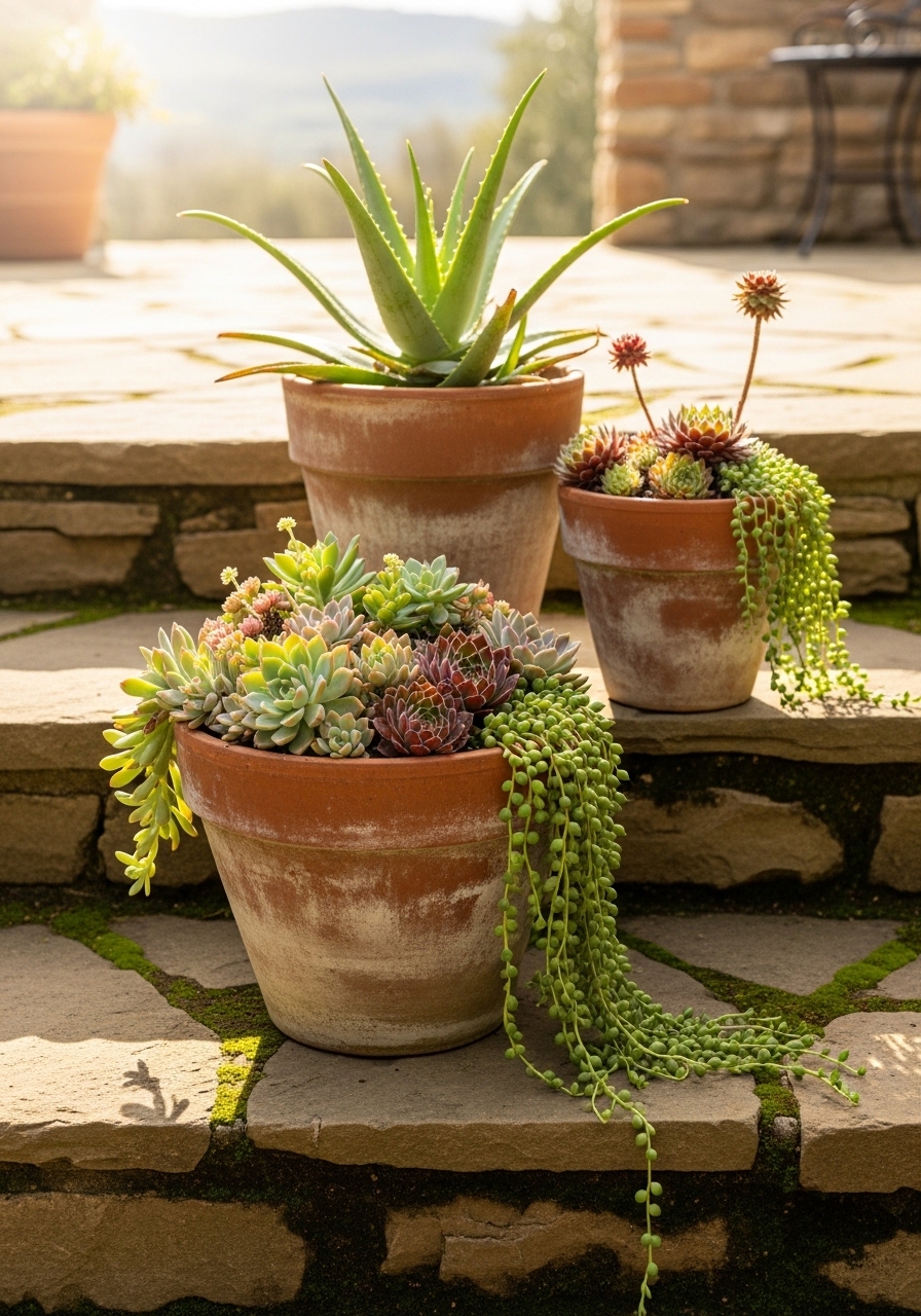 I group terracotta pots in three sizes for layered visual weight. The warm clay pairs well with white and grey furniture. I use terracotta pot set. Styling tip: stagger heights and plant types—one tall, two medium, three small. Mistake: same-height pots—they look flat.