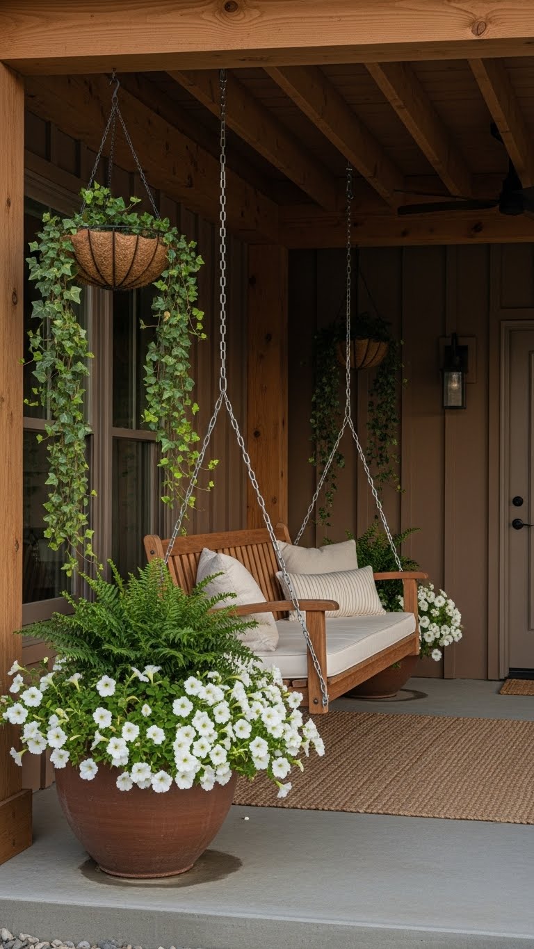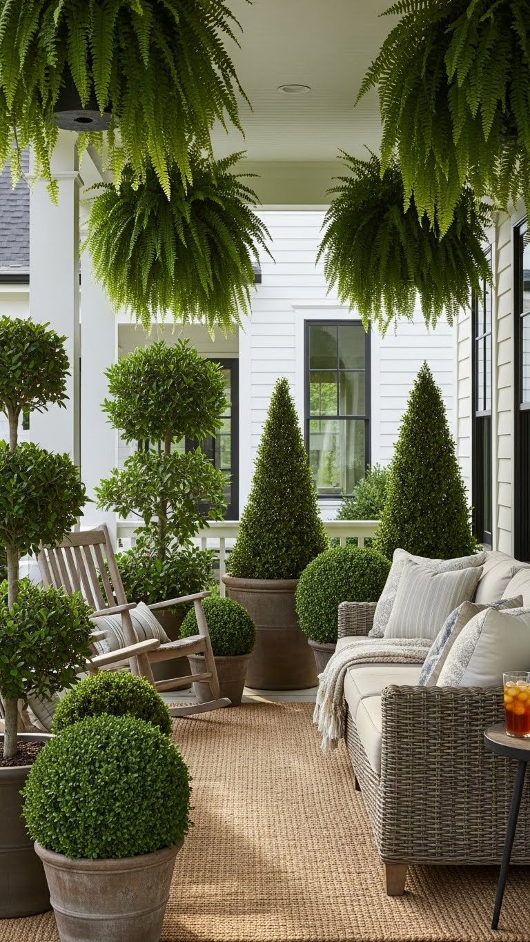 Get fern plants for $5 each. Hang them with hooks. Add topiaries in pots nearby. This layers interest. DIY idea: Trim the topiaries yourself. Water ferns twice a week. Keep it under $30. Hang high for flow. This setup greens up the area.