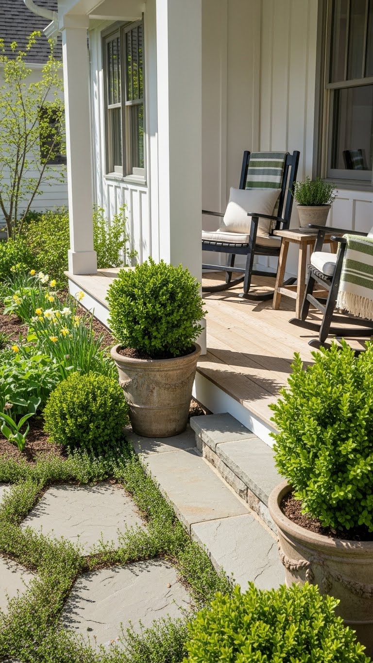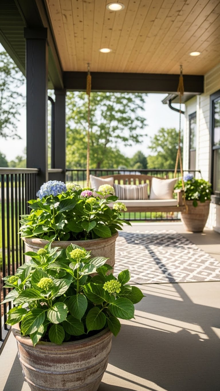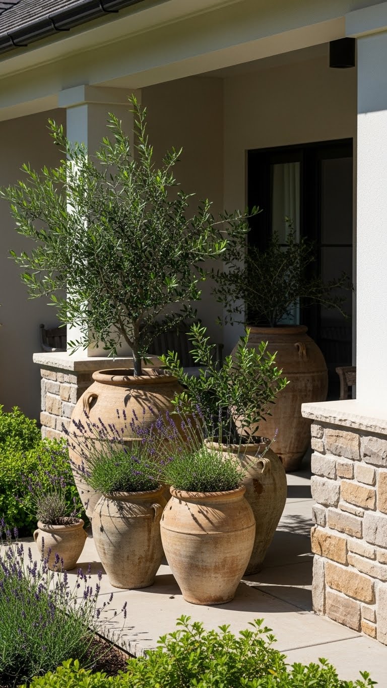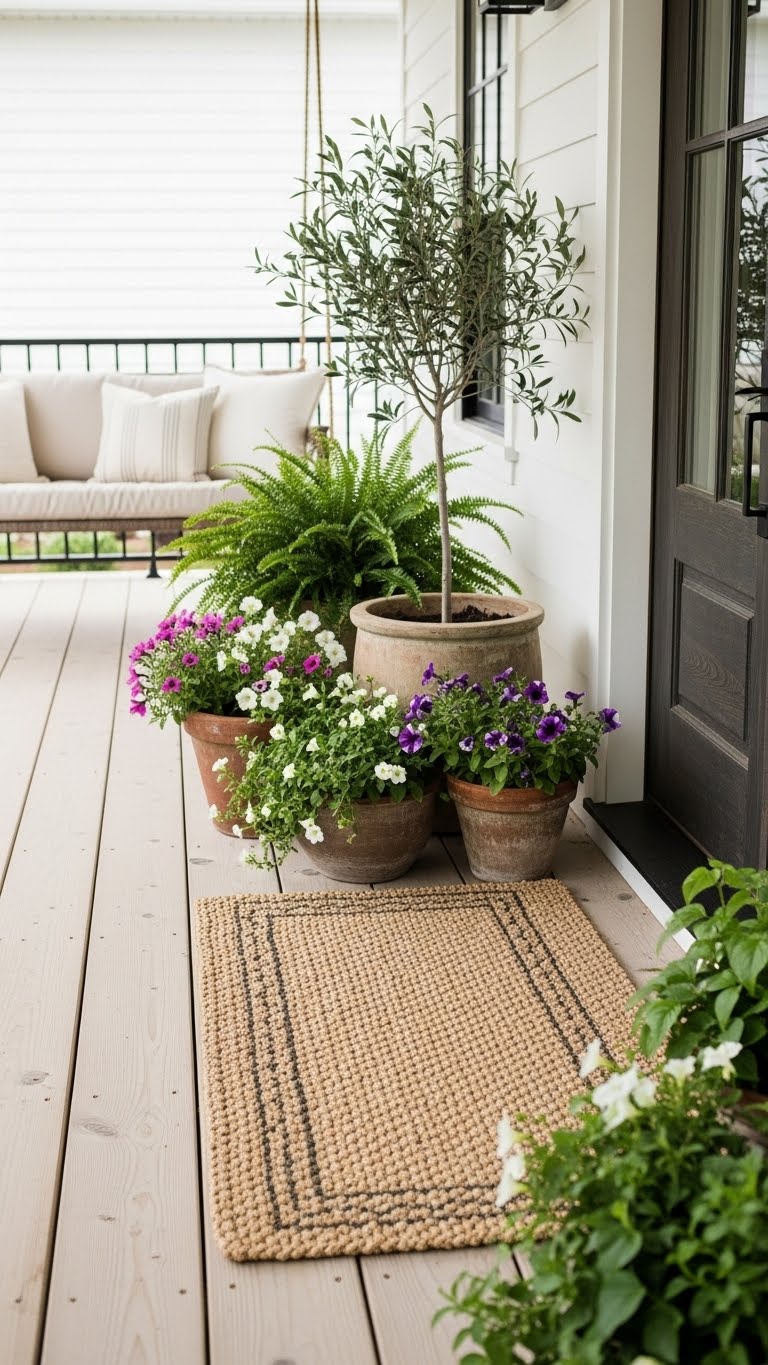 Find clay pots at garden centers for $15 each. Fill them with deep green plants like olive trees. This adds a fresh vibe. Set them near the entrance. DIY tip: Plant seeds from your kitchen scraps. Water them weekly. Mix in dark baskets for extra style. Keep it affordable at $25 total. Arrange in corners. This blend creates depth. Watch your porch feel alive.