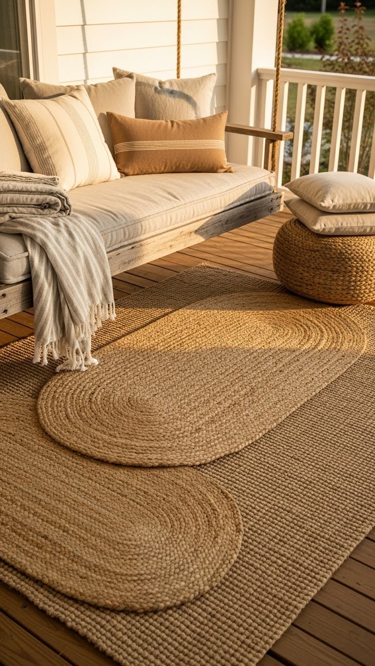 Get a jute rug for $20. Layer with cushions. This adds touch. DIY tip: Wash fabrics often. Total: $30. Drape over spots.
