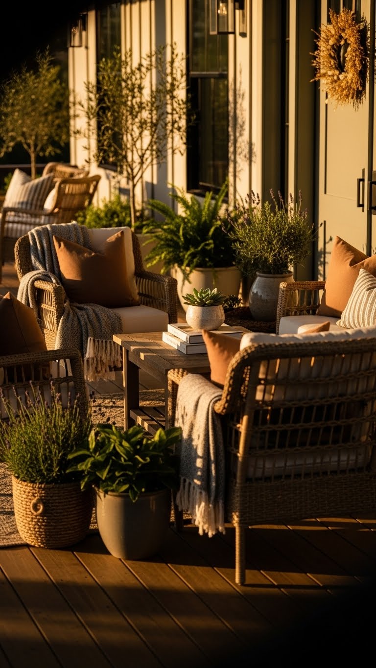 Pick paints in soft browns or dusky yellows from hardware stores. These colors replace stark whites easy. Buy a sample can for $10. Test on a small area first. Roll it on your porch walls. This change warms up the spot quick. DIY idea: Mix in old pillows with earthy fabrics. Grab them at flea markets for $5 each. Layer them on seats. Keep it simple. One wall at a time saves money. Aim for $30 total. Watch how it shifts the mood.