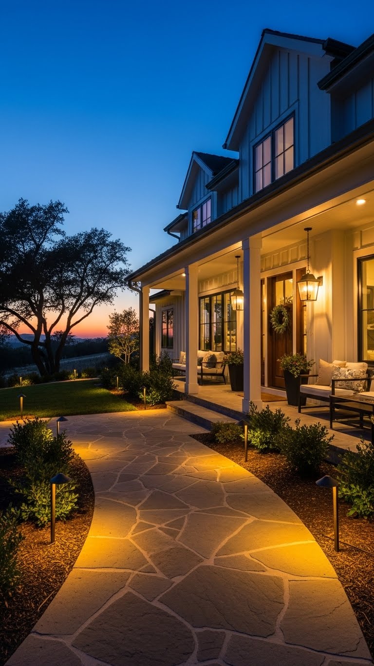 Add path lights for $12. Line the edges. This sets mood. Stake in ground. DIY idea: Charge solar ones. Total: $12.