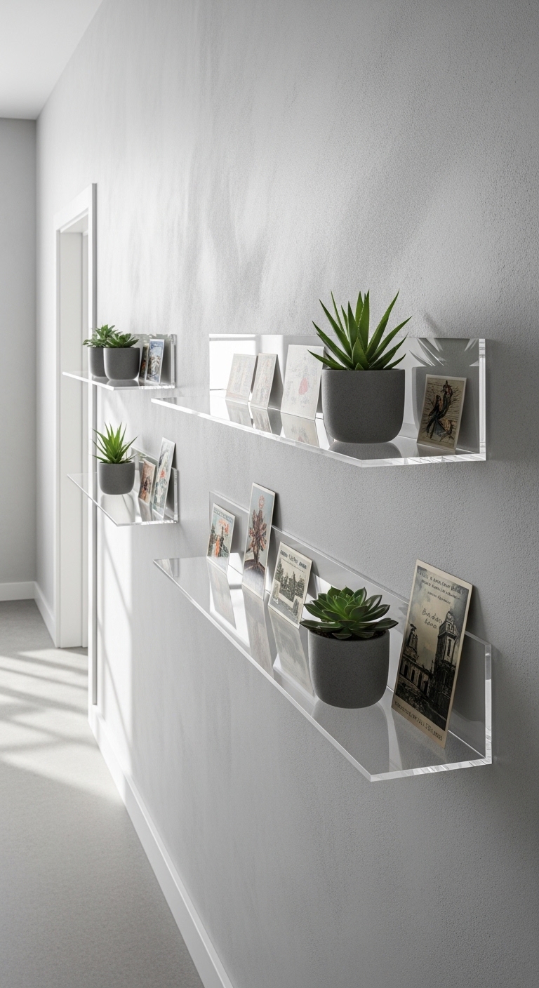 Acrylic ledges keep things light and contemporary while showcasing small items. They’re invisible supports that let your decor shine. Added these to my bathroom wall, and they made the space feel bigger, less cluttered – like magic.