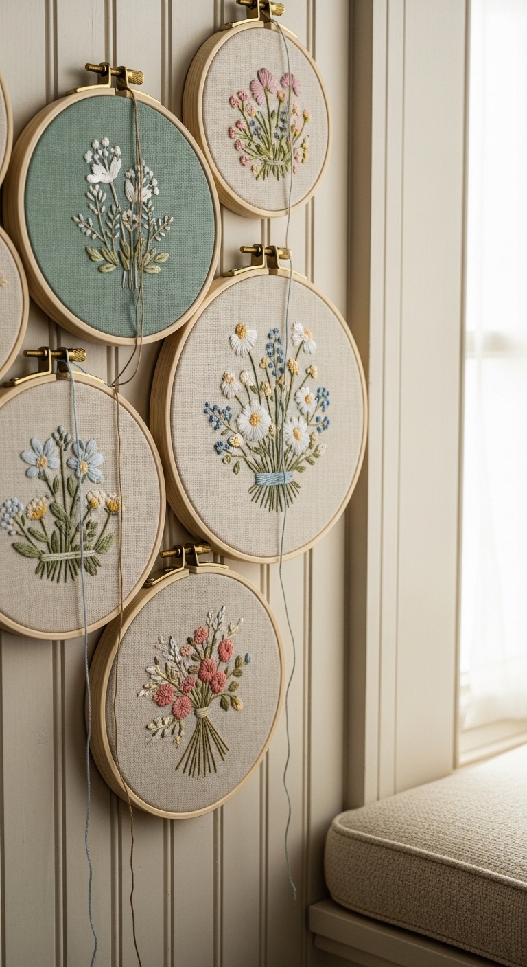 Hoops with embroidered fabrics create affordable, customizable art clusters. Mix patterns for a personal gallery. I stitched a few for my sister’s gift, and now they’re a staple in my craft room – so therapeutic to make.