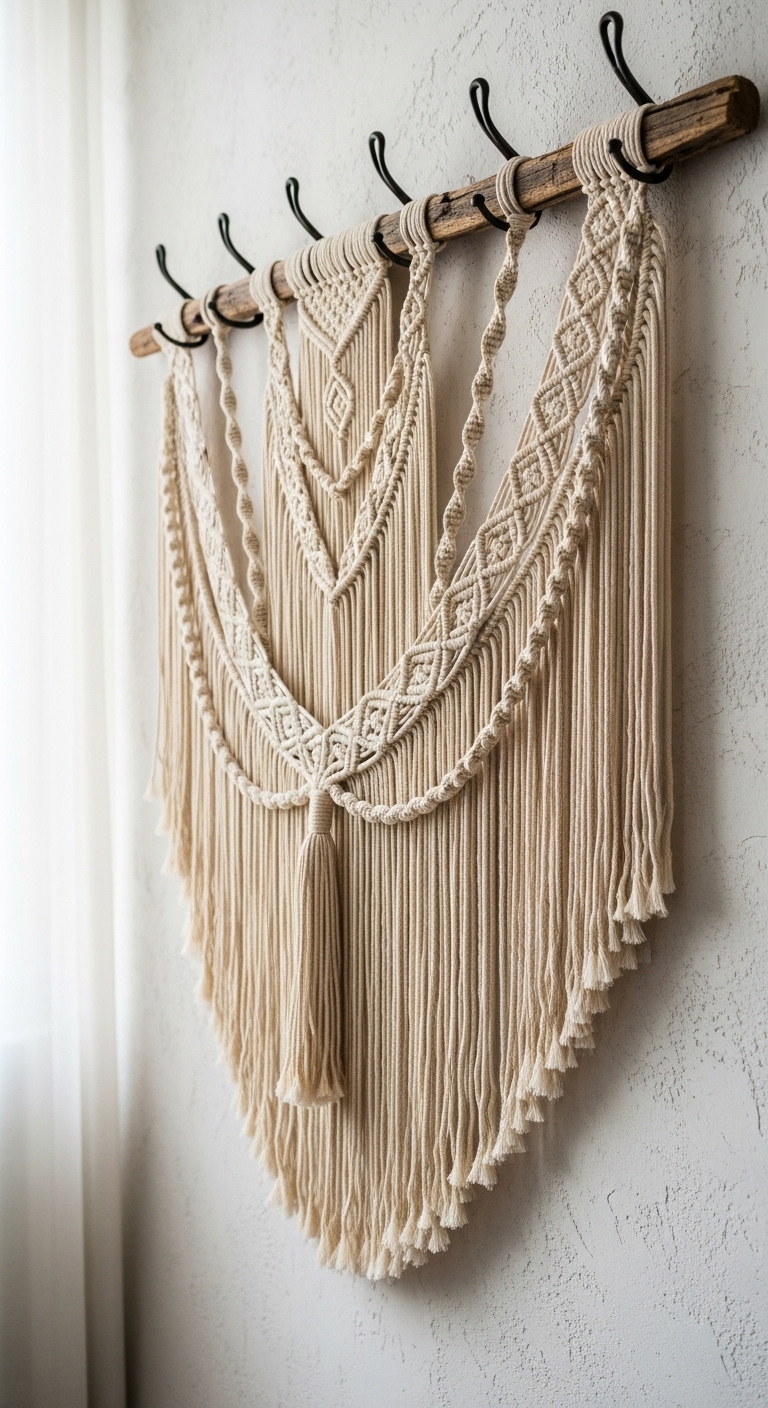 Macrame brings a boho twist to modern farmhouse without clashing, especially in soft neutrals like cream or taupe. I knotted one up for my office wall during a rainy weekend, and it softened the space instantly – plus, it’s super forgiving if your knots aren’t perfect. Hang it above a console for that layered, textured effect you can feel good about.
