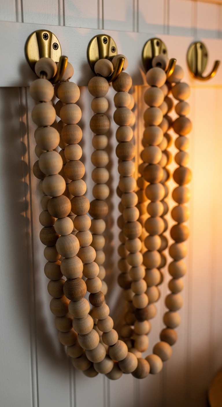 Bead garlands add a subtle, tactile element to walls without overpowering the neutral scheme. I strung some across my mantel last holiday season, but kept them up year-round because they just fit so well – a little bohemian flair for farmhouse. They’re inexpensive and easy to customize with different bead sizes.