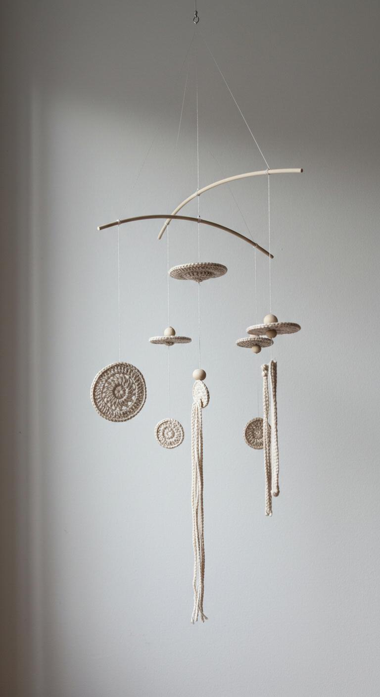 Choose neutral yarns and modular forms; balance weight and rhythm for striking mobile design.