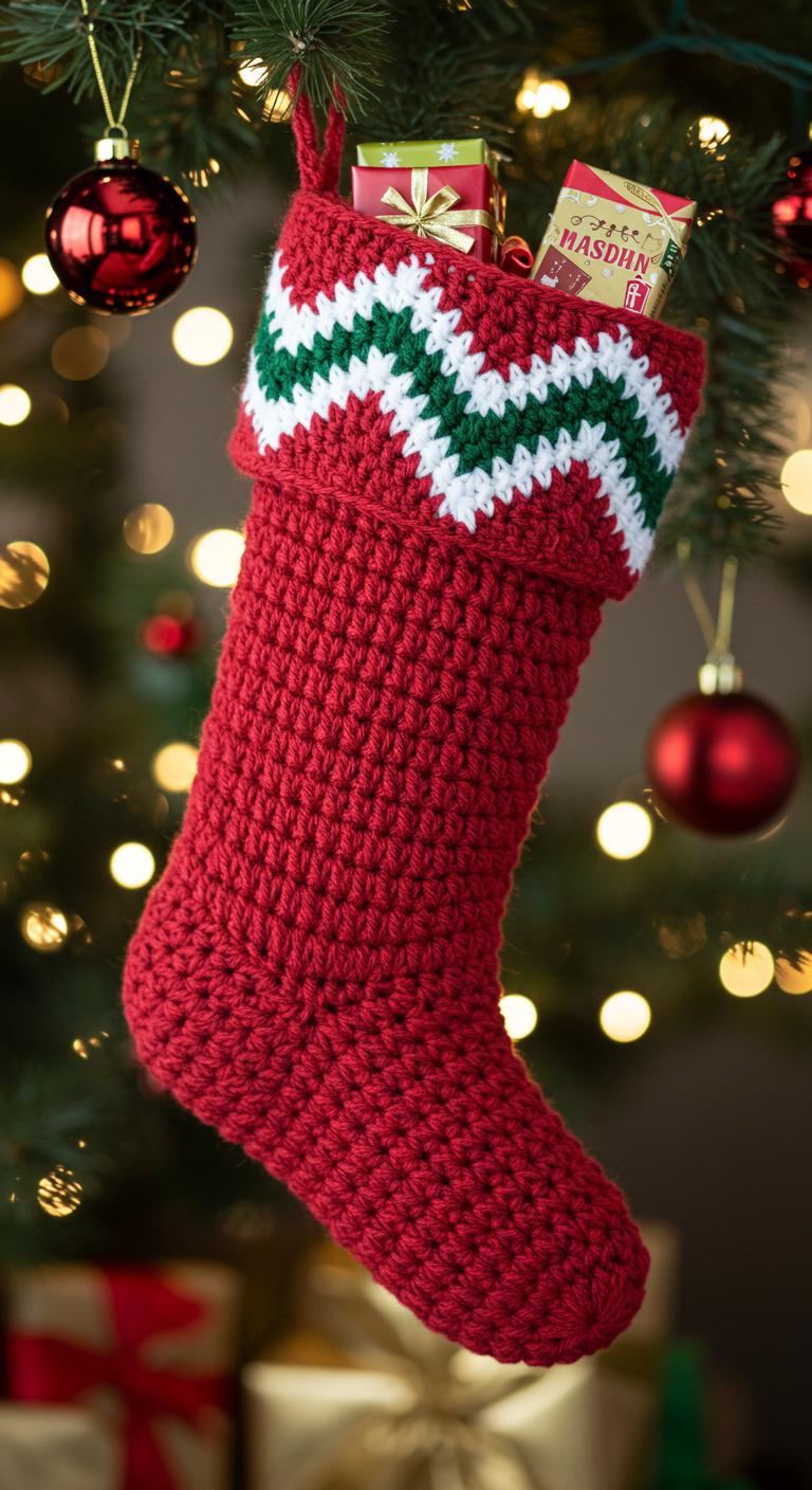 Ready to add a modern twist to a classic stocking? You’ll crochet a bold chevron design cuff using simple V-stitches, adjusting stripe width to suit your vibe. Choose contrasting festive colors, work short rows for shaping, and finish with a neat picot edge. You’ll hang a statement piece that feels fresh, freeform-friendly, and perfectly contemporary for holiday décor.