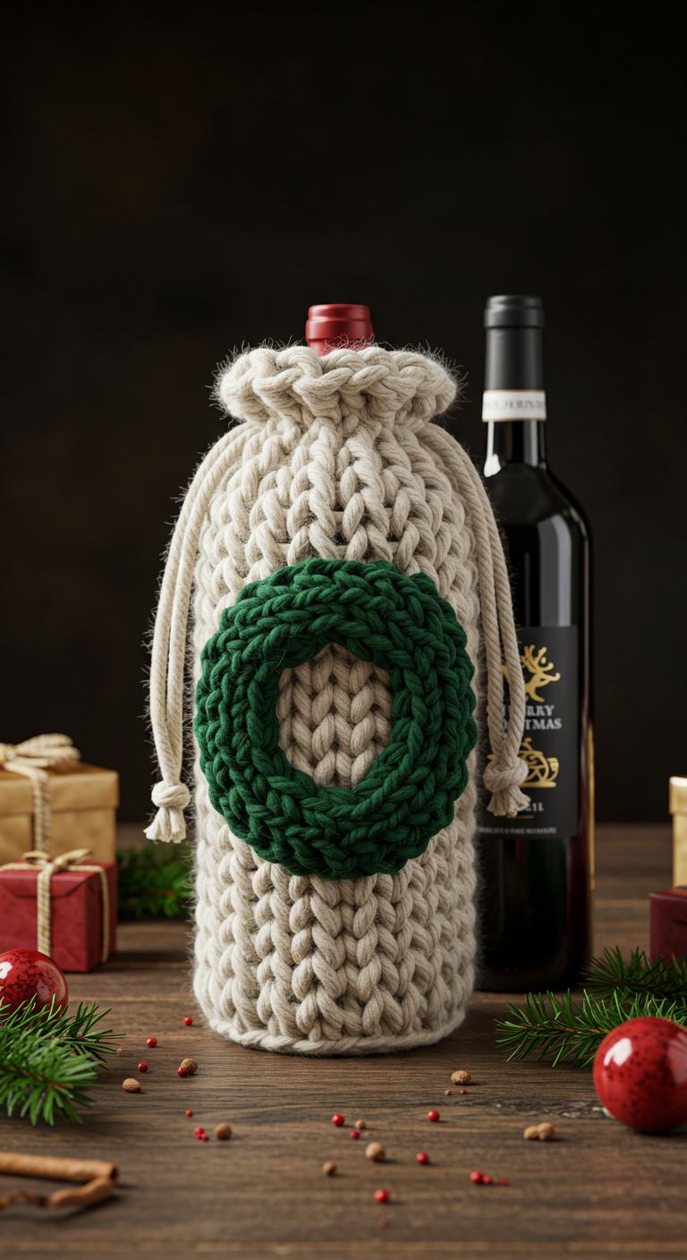 If you loved the layered evergreen wreath, you’ll find the same bold texture and modern minimalism works beautifully on a holiday wine bottle gift bag. You’ll crochet sleek wine bag patterns using chunky yarn, simple stitches, and a drawstring top. Follow measured sizing for bottle fit, add a loop for gift tags, and embrace minimalist holiday gift wrapping that feels freeing and effortlessly chic.