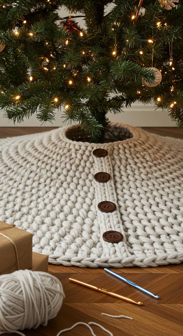 Because you want a clean, fuss-free base for your tree, this simple buttoned tree skirt uses chunky yarn and oversized buttons to create a modern, minimalist look that’s easy to crochet and adjust.