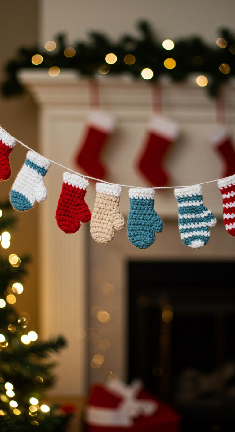Make a string of tiny crochet mittens to add playful, handmade charm to your mantel or tree — they’re quick, portable, and perfect for using up sock-weight scraps. Choose tiny mitten sizes, mix bold mitten color combinations, and crochet simple rounds, thumbs, and cuffs. Join mittens on a slim cord, spacing evenly. You’ll finish fast and feel free to remix colors.
