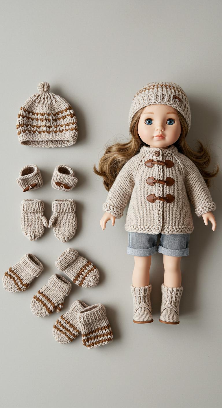 Adopt Scandinavian doll trends by choosing simple silhouettes and natural fibers. You’ll mix minimalist sweaters, color-blocked mittens, and streamlined hats using easy stitch repeats.