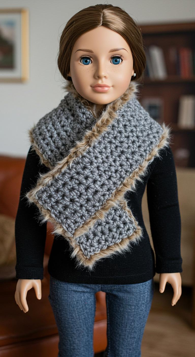 A cozy faux-fur trim scarf gives your doll an instant luxe look with minimal effort, pairing soft, tactile trim with a simple crochet body that’s perfect for quick projects.