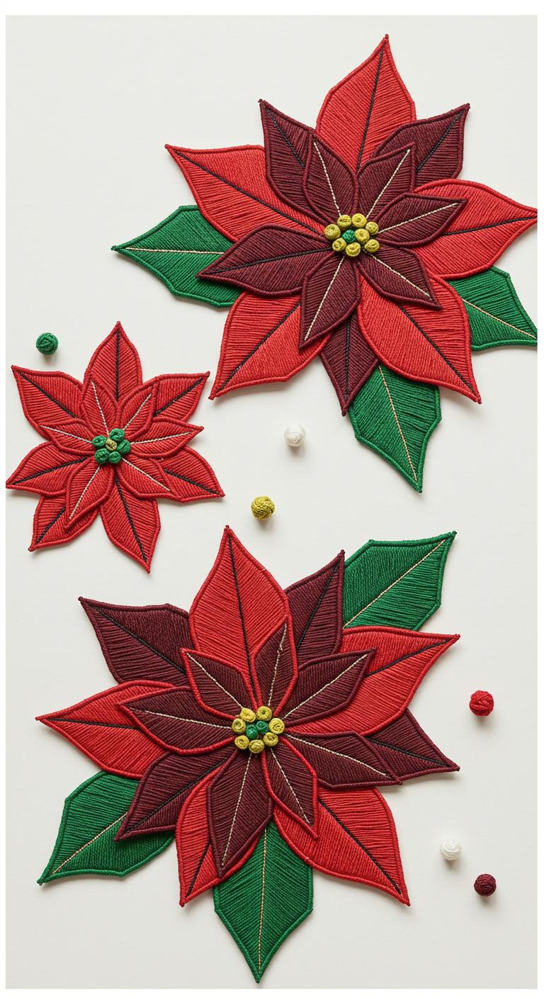 Think modern: you’ll build a sleek poinsettia appliqué by layering geometric petals, mixing matte and metallic yarns, and keeping stitches crisp for a graphic look.