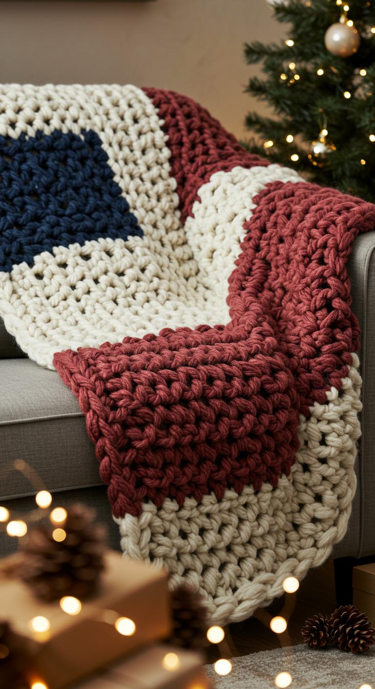 If you’re aiming for fast, cozy holiday impact, a chunky plaid blanket delivers timeless pattern with minimal fuss: choose bulky yarn and an oversized hook, work simple block stripes, and join sections with visible seams for bold plaid pattern contrast.