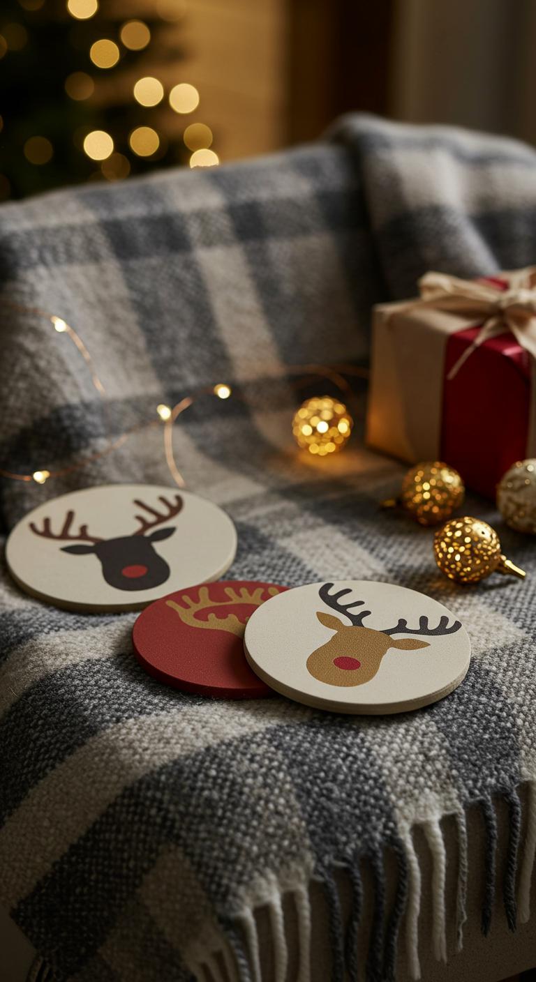 After finishing a chunky plaid blanket, you can shift focus to small, stylish accents like contemporary reindeer coasters that add instant holiday flair without a big time investment. Choose a reindeer color palette that feels modern — muted neutrals with a pop accent. Follow simple coaster construction techniques: single crochet rounds, surface slip-stitch antlers, and a firm border for durability and effortless gifting.