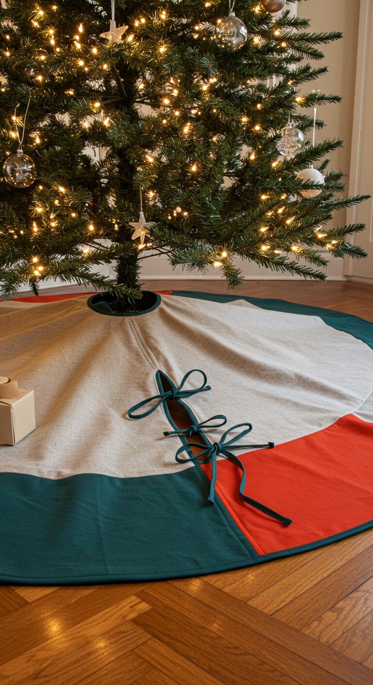 A colorblock Christmas tree skirt gives your tree an instant modern update, and you can stitch one quickly by pairing bold blocks of muted neutrals with a single pop accent.