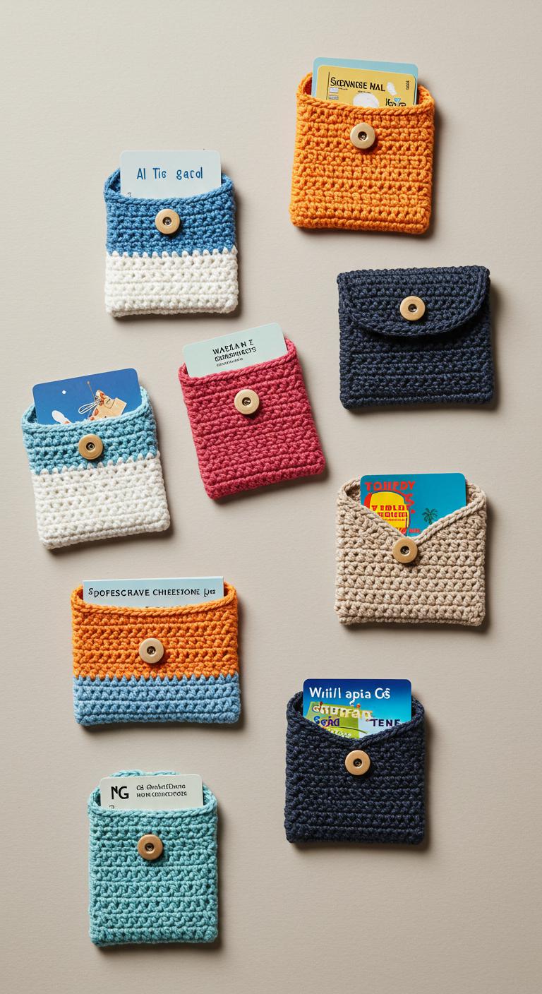 If you liked the clean geometry of bauble covers, shrink that same streamlined approach down to tiny gift card holders that make small presents feel designed and deliberate. You’ll mix basic crochet techniques—single crochet, slip stitch, color-blocking—to craft slim pockets, snap flaps, or minimalist envelopes. Follow tight gauge, add a bit of contrast, and let gift card creativity elevate simple wrapping into something bold and free.