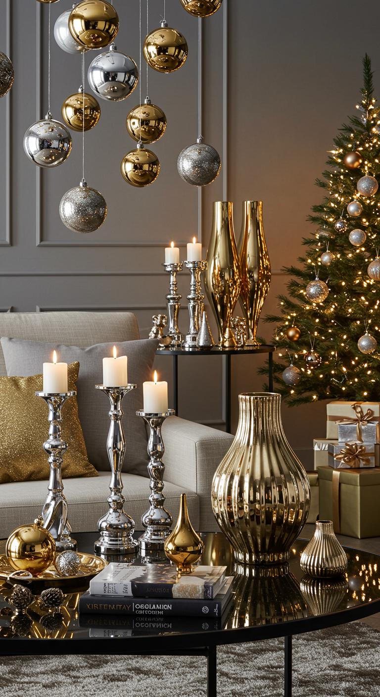 Incorporate shimmering gold or silver ornaments, chic candleholders, and striking metallic vases to reflect light and warmth.
