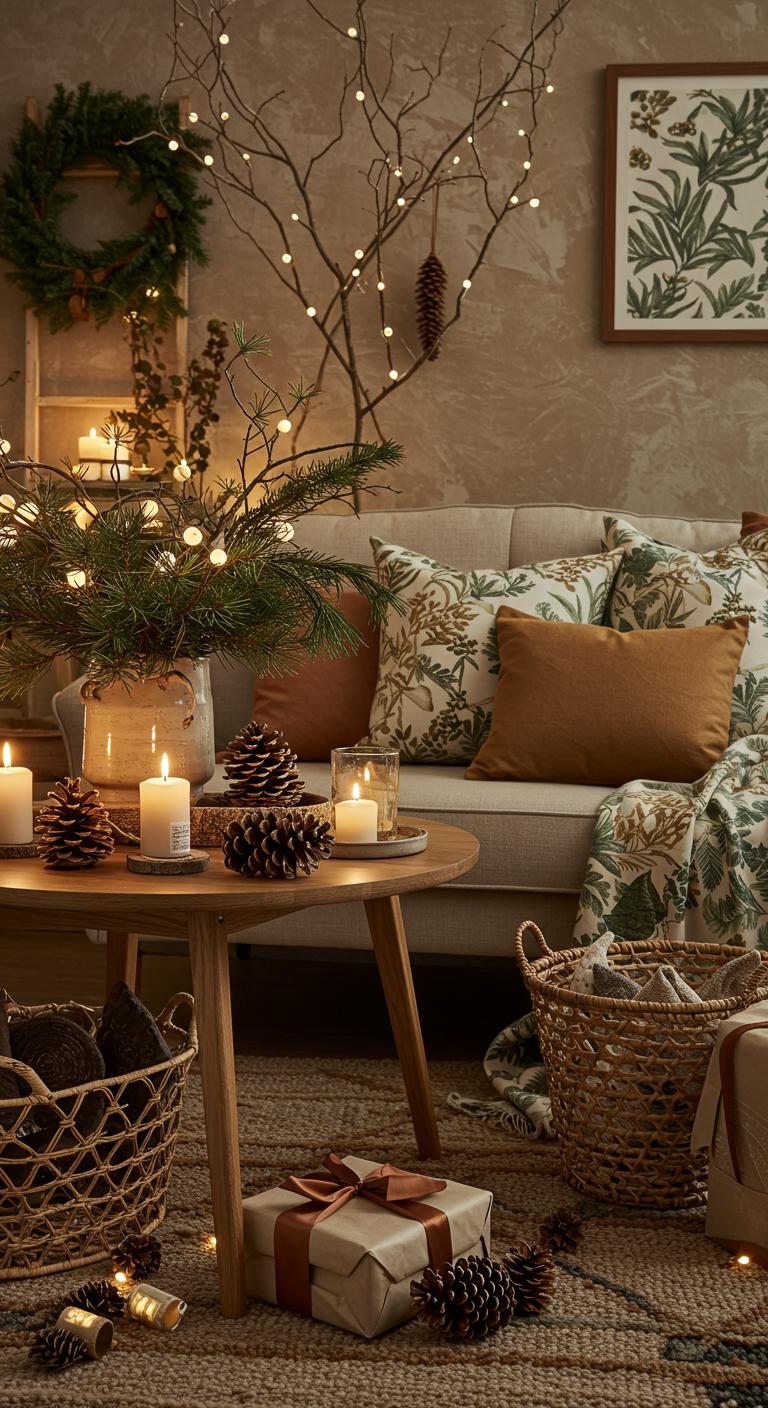 Use natural elements like pinecones and branches in your decor, layering in organic textures through cozy textiles and woven baskets.